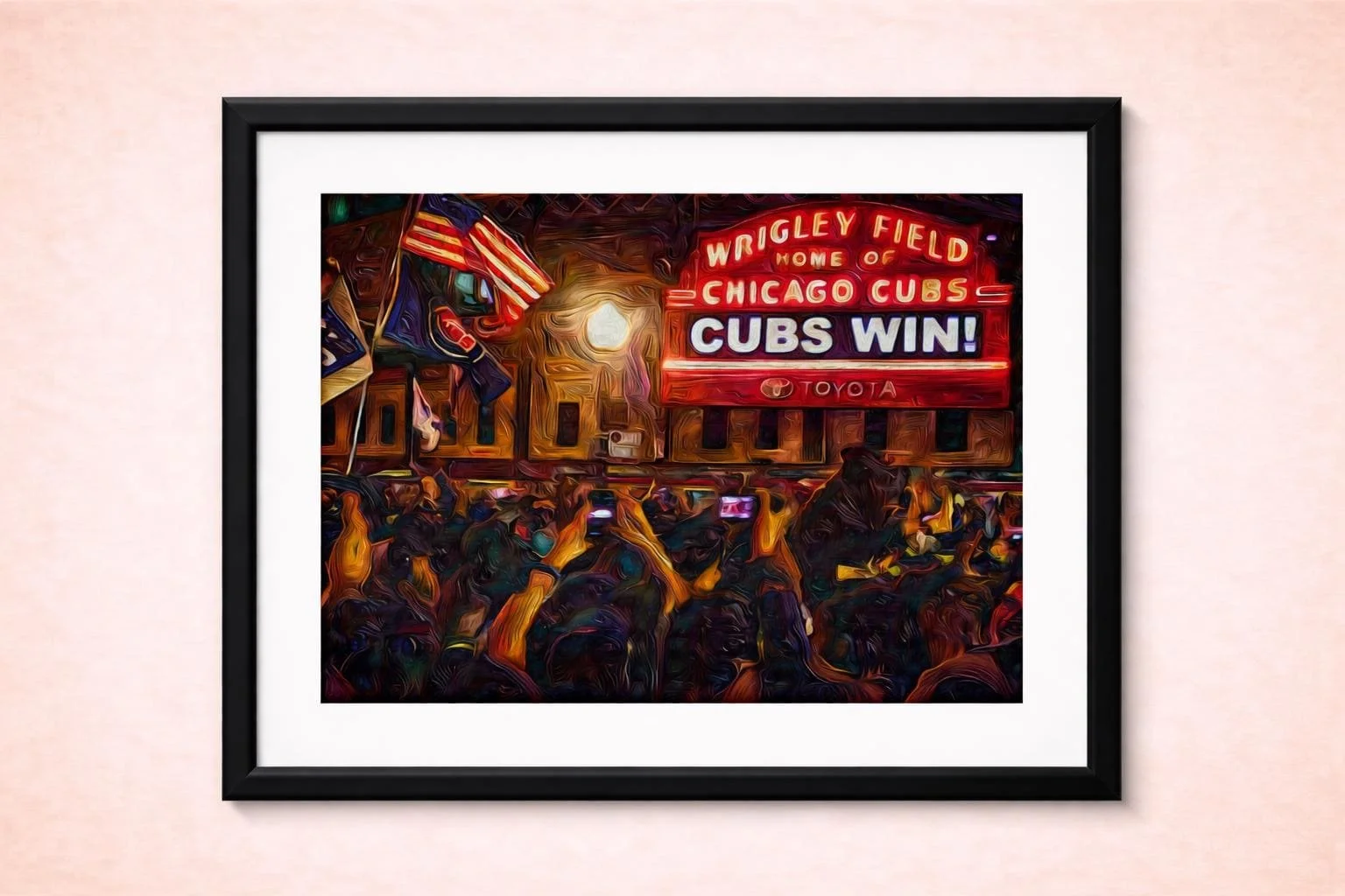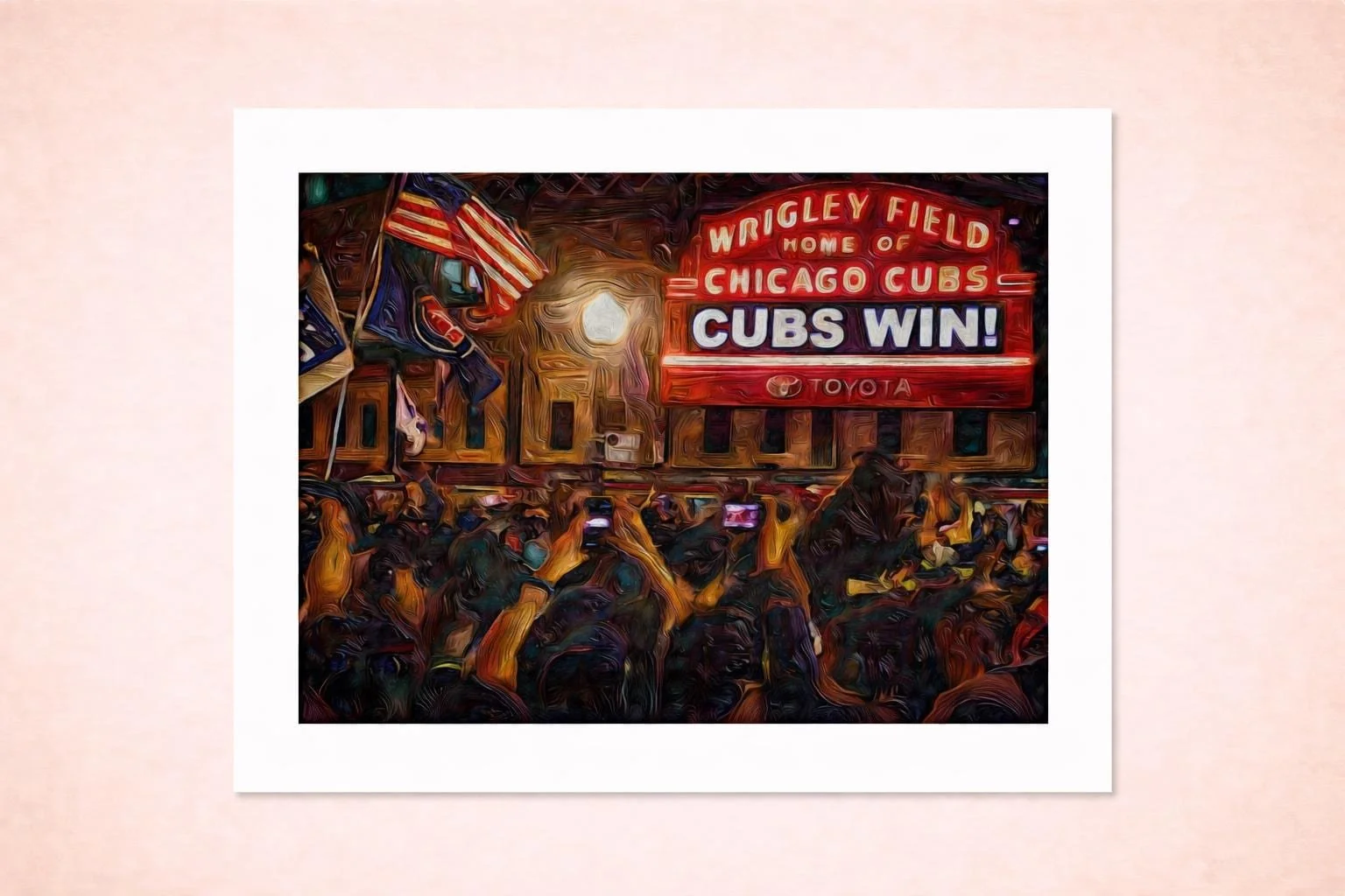 This piece captures the historic energy of a World Series Victory at Wrigley Field - a night generations of Chicago fans waited a lifetime to see. The iconic marquee glows with triumph as the crowd surges beneath it, flags waving, phone raised, and the city collectively holding its breath in celebration.